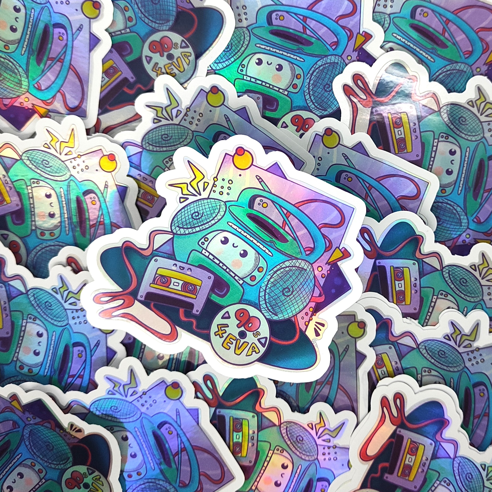 90s Life Series – Booming Box radio, Printed on Holographic sticker paper printed with eco-solvent ink and are liquid laminated for extra protection against scratches and the elements.