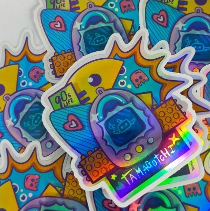 90s Life Series – Virtual pet and arcade games before consoles at home, Printed on Holographic sticker paper printed with eco-solvent ink and are liquid laminated for extra protection against scratches and the elements.