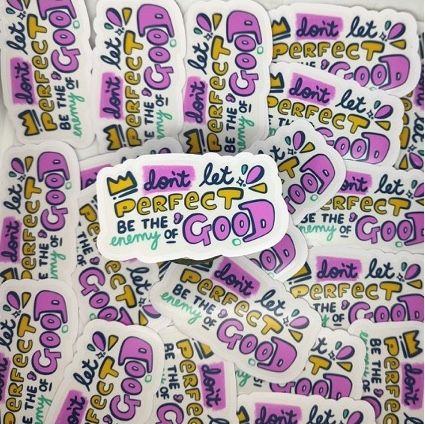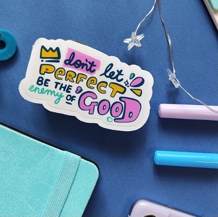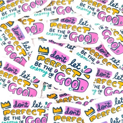 Die cut sticker, printed on vinyl – Don’t let perfect be the enemy of good – 75×42 mm with 3mm easy peel bleed