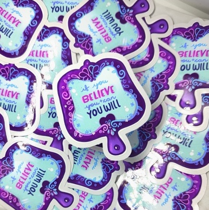 Die cut sticker – If you believe you can you will printed on White vinyl 75x61mm with easy peel bleed.