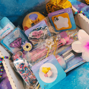 Shining Starr Scoops — mystery bundles packed with memo pads, stickers, washi tape, clips, and original designs, carefully curated to spark joy and surprise. Each scoop uniquely filled with between 5-11 items that spread magic, whimsy, and joy one customer at a time.