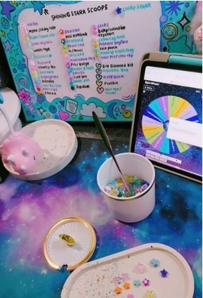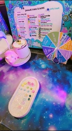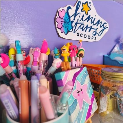 Shining Starr Scoops — mystery bundles packed with memo pads, stickers, washi tape, clips, and original designs, carefully curated to spark joy and surprise. Each scoop uniquely filled with between 5-11 items that spread magic, whimsy, and joy one customer at a time.